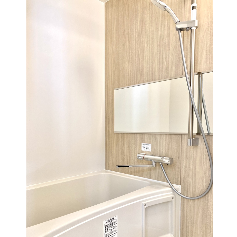 壁に木目を取り入れることで、リラックスしたバスタイムを演出しました。 一日の疲れを目と体で癒せる至福の時間に。